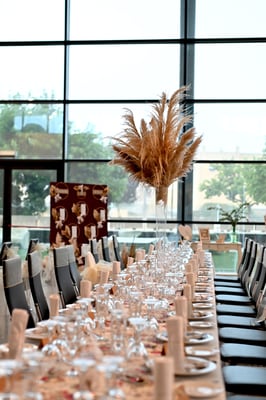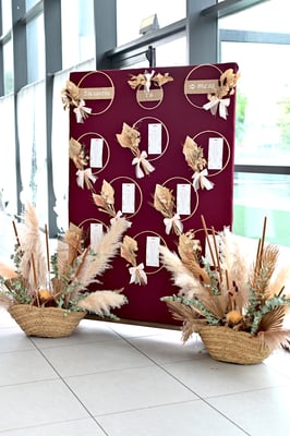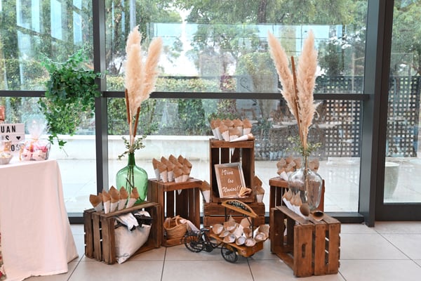 En la decoración optamos por no cargar con muchos detalles, tampoco el salón ni los rincones. Así que nos fuimos a la floristería de Sonia de Faura y nos decidimos por pampas, eucalipto y unas pinceladas de pequeñas rosas blancas para la ceremonia. ¡Quedó precioso!