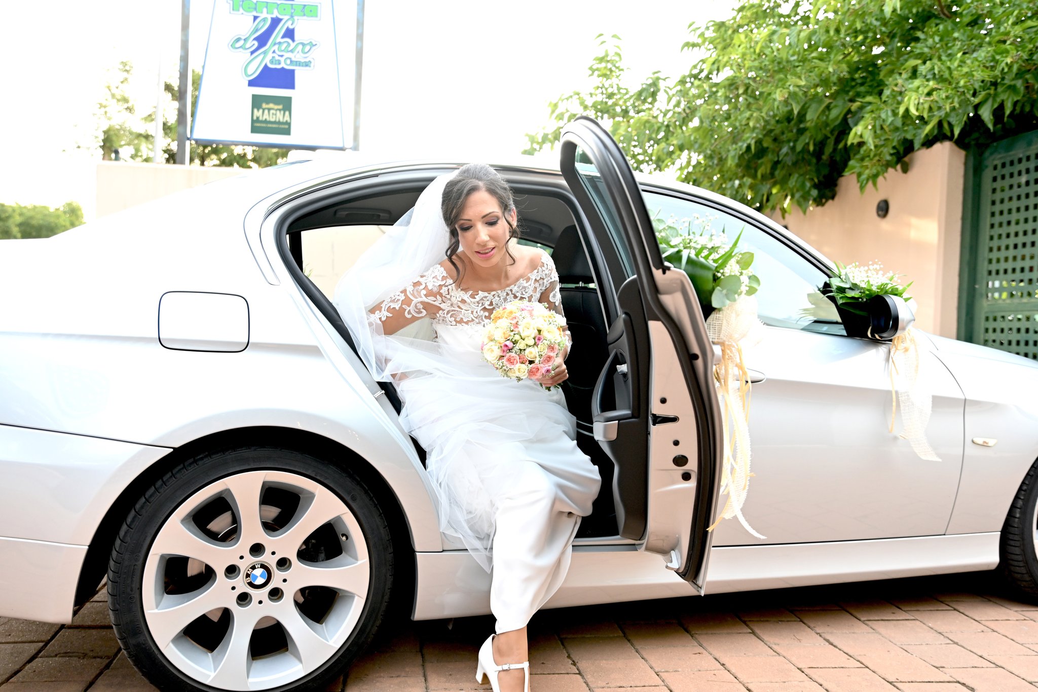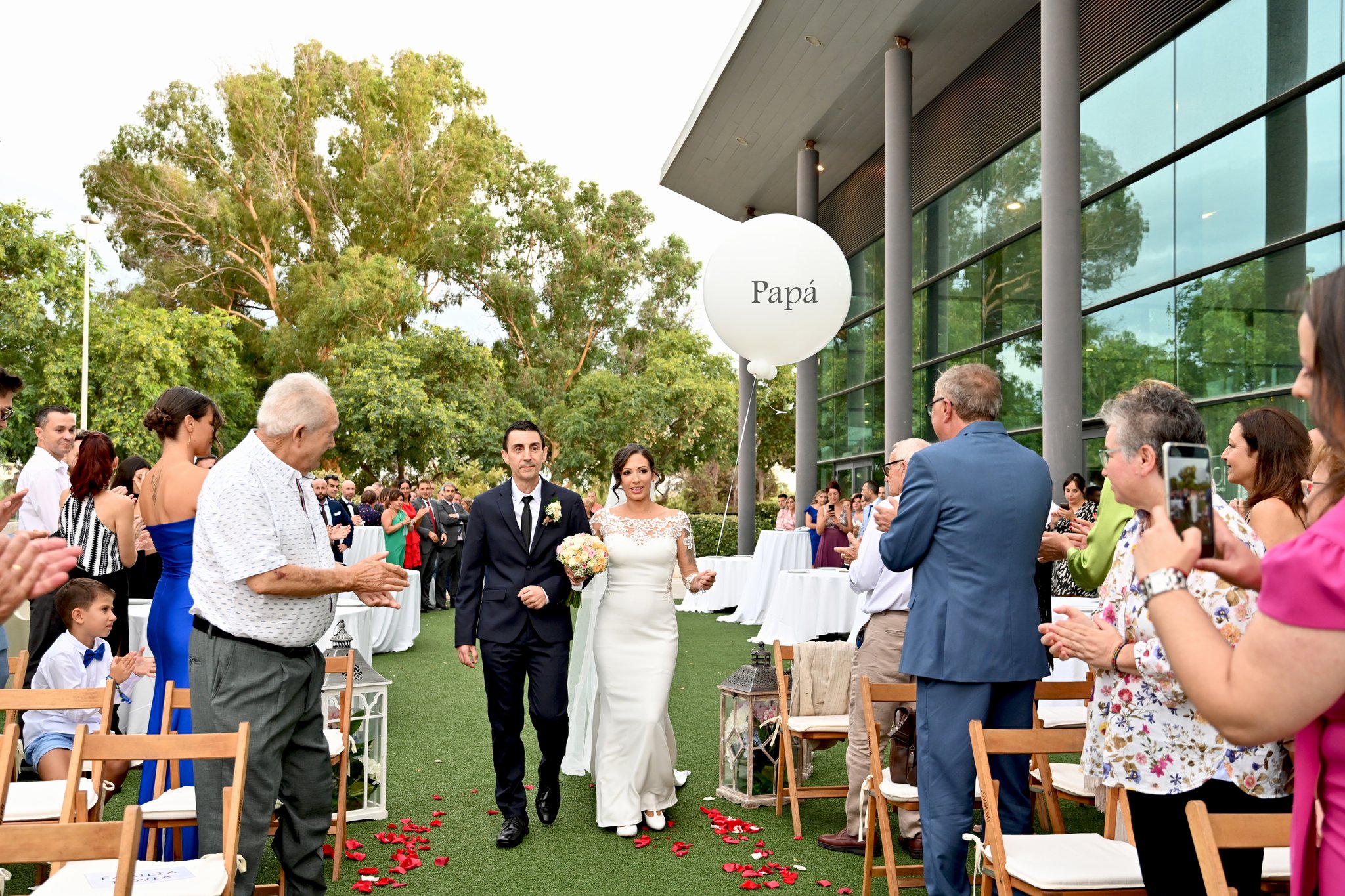 Ya lo teníamos todo preparado y llegó ella radiante, siempre con él (su padre) muy presente. No podía ser de otra manera y apareció con el ramo que preparó para ella Flores Feli de Puerto de Sagunto, que luego llevó al cementerio.