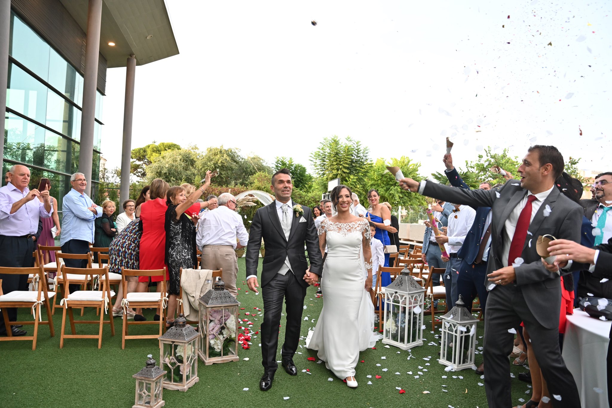 Por la tarde a partir de las 18:00 horas empezó a despejar poco a poco y fuimos viendo que iba saliendo ese sol que nos hacía ver que podíamos confiar en él. Justo a las 18:45 horas, antes de que llegaran los novios, sacamos todo del salón y lo pusimos en los jardines.